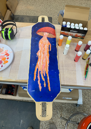 During the start of the COVID-19 pandemic, I, like so many, turned to fun projects as a way to cope with the events going on in the world. This was my first attempt at a skateboard, which I designed and fabricated with pretty much no skateboarding experience. It sounded like a fun project that would teach me new skills, so I went for it! I learned how to laminate veneer using a vacuum press to create a durable and flexible deck, and I learned about the hardware used in different kinds of skateboards. I also got to do some fun painting and match the wheels to the deck art.